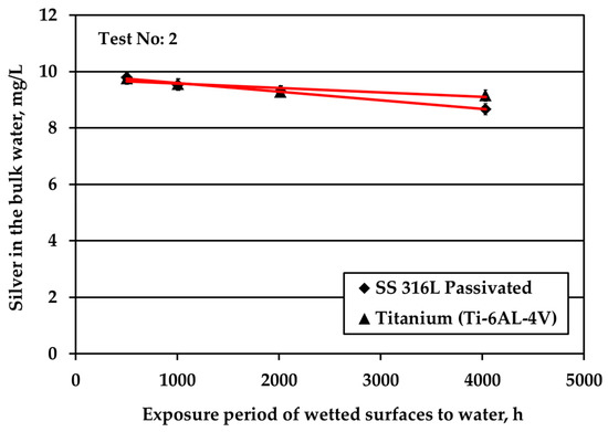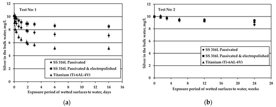 The decrease of the S/V parameter by one order of magnitude, at 0.1 cm−1, leads to a continuous and almost linear reduction of silver, as shown in Figure 1b. The same behavior is presented by the passivated SS, as well. However, the rate in the case of Ti alloy is higher. Regarding the passivated & electropolished SS coupons, there is a change in the rate of Ag reduction after 12 weeks of exposure period that is attributed to employing a different batch of coupons: data points at the initial four exposure times are obtained by using coupons that show higher potential in silver deposition compared to the data points at the two longer times that are more resistant to silver deposition. This behavior is observed although the specifications for the electropolished material are identical for both batches. The difference is attributed to the rather uncontrolled machine finishing of the coupons during their manufacture, as it turned out by the clarifications provided by the manufacturer. Passivated & electropolished SS coupons exposed to water up to 6 days behave similarly to the other two metals, as shown in Figure 1b. However, after 12 weeks of exposure to water with 10 mg/L Ag, Ag concentration is comparable with six weeks of exposure, whereas only a trivial further reduction is observed for up to 24 weeks. On the other hand, it should be taken into consideration that a small reduction in Ag bulk concentration corresponds to high Ag deposition variations since the S/V ratio is low and Ag concentration is high. Ag ion concentration reduction in water is strongly related to the deposition phenomena of Ag onto different types of solid surface material. Previous studies revealed the underlying deposition phenomena for both SS and titanium alloy materials [12,13]. On SS surfaces, silver is deposited in its metallic form, in line with a galvanic deposition mechanism [12]; while on titanium alloy Ti-6Al-4V it is deposited in its ionic form, in line with either a galvanic deposition or ion exchange mechanism [13].