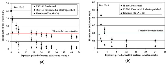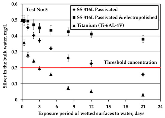 Figure 2 depicts the results obtained when testing the potable water (0.5 mg/L Ag) against three different solid surfaces under stagnant conditions and nitrogen headspace. The red line is added to signify the threshold Ag concentration, 0.2 mg/L, set by the space agencies to warrant sufficient disinfection of potable water. As shown in Figure 2a, at S/V equal to 1.0 cm−1, when water is in contact with Ti alloy, Ag is almost fully depleted after about 6 h of the exposure period. For the SS316L materials, Ag is rapidly reduced from the bulk water in the first 6 h; next, the reduction rate becomes gradual and after 32 h silver reduction rate tends towards a plateau (although a small rate is still noticeable). At the very end of the test, Ag is almost fully depleted in the case of passivated SS316L, while for electropolished SS316L Ag concentration is slightly below the threshold limit of 0.2 mg/L. Regarding titanium alloy, Wallace et al. [6,7] also recorded a remarkable silver reduction in the bulk, since the residual silver ions concentration was only 0.025 mg/L after 1680 h of exposure period and initial silver fluoride concentration into water of 0.4 mg/L. The test coupons were inserted to the test setup at S/V ratio around 0.6 cm−1, while prior to exposure, the test coupons were passivated for 24 h into water containing 100 mg/L silver ions. The results of Figure 2a show that although silver deposition was high during passivation (initial 24 h), its deposition continued during the exposure experiments.