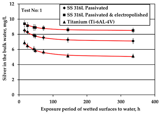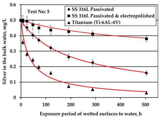 Ti alloy surface triggered fast Ag loss from the bulk water since after only three days Ag passes below the limit of 0.2 mg/L Ag. Regarding the SS solid surfaces, Ag loss is faster for passivated SS316L than for electropolished SS316L material. Ag loss for passivated SS316L solid surface is comparable with that reported in ATV processes [4]. Rough comparisons between the Figure 2b and Figure 3 (Ag depletion in potable water in the absence and in the presence of water flow, respectively) indicate that either Ag deposition is independent of water flow or that even minor movements of water during water storage contribute to Ag transfer to the surface (for example, these movements could be because of chamber vibrations).