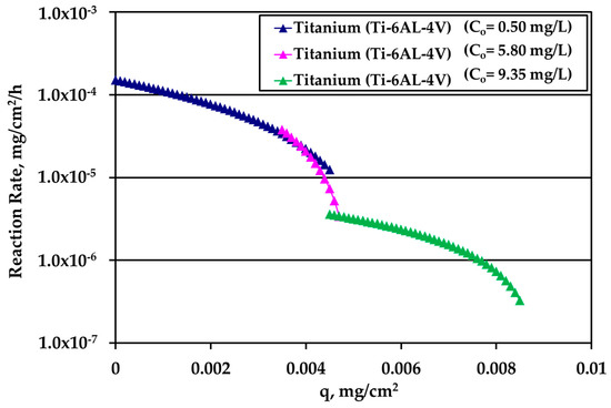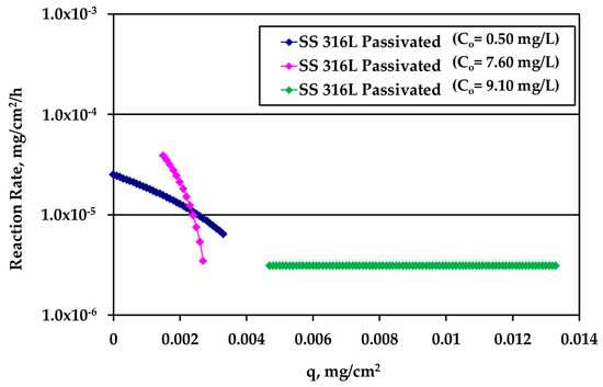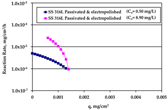 The rate data for electropolished SS316L appear in Figure 8. The rate is clearly higher for higher Ag bulk concentration and the difference decreases as q increases. The loading capacity qm of tests under water motion appears to be much smaller for this solid surface. Finally, the reaction rate for Ti alloy is presented in Figure 9. There is an overlap between the data from the experiments performed under water motion and experiment conducted at high Ag concentration (10 mg/L) and S/V = 1.0 cm−1 in stagnant conditions, indicating an independence from bulk concentration at the common range of loading q. In case of Ti, the whole set of rate data can be described by a single curve for q dependence as it is clear in Figure 9.