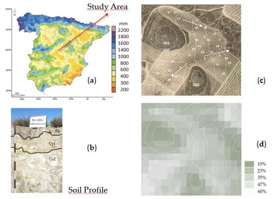 The plot under study is found in a rolling landscape, located between two hills with slopes between 12% and 14%, showing three different small watersheds with different orientations (Figure 1c). The sampling points were located between 540 and 560 m above sea level quite evenly distributed following a systematic random sampling design. The soils under study are described predominantly as Haplic Gypsisol in the low-lying areas [] and as Gypsiric Regosol (WRB, 2014) in the higher lands. The study plot sized 3.7 ha hectares, shows mostly the later regosol type (Figure 1b), which includes shallow soils with Ap horizon being about 15 cm depth, with loamy texture and dry soil Munsell color 10YR 6/2, followed by Cy1 and Cy2 horizons with dry soil Munsell colors 10YR 7/2 and 10YR 8/1 respectively. Young olive trees were planted in this field in 2006 spaced 6 × 7 m and managed by minimum tillage up to 15–18 cm depth. Therefore, deeper layers were unaffected by chisel plow.
