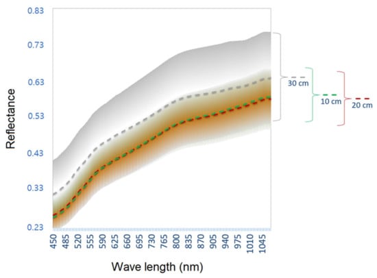 Soil diffuse reflectance mean and standard deviation of samples at three different depths are presented in Figure 2. As expected, minor features are shown in the visible and near-infrared portions of the spectrum []. In this study, soil spectrum signatures were not significantly different for the two first layers, which confirms physical–chemical data in Table 1. However, soils collected at 30 cm showed higher reflectance, higher gypsum and less SOC (Table 1). Lower SOC content lead to higher reflectance, which is frequent in drylands [,], especially when calcium carbonate and gypsum are abundant in soils []. Differences in soil reflectance of the plot of study can be observed by brightness index calculated from Sentinel 2 images (Figure 1d).