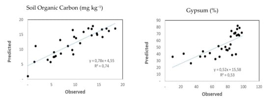 The calibration of ParLes software was performed with 60 randomly selected samples, and the validation with the remaining 30 samples. The cross-validation predictions of SOC produced an RMSE equal to 3.4 g kg−1; the R2 value was 0.74 (Table 3), which coincides with the average R2 reported for the visible range of the electromagnetic spectrum in a review gathering examples of SOC estimates from soil reflectance []. The statistics for predictions of the rest of the soil parameters were not considered accurate due to low R2 and RPD values. The observed versus predicted values for all the variables considered in the model are shown in Figure 3. Only SOC content showed a significant fit (R2 = 0.74), and fair quantitative predictions (RPD = 1.47). The second most important soil component that could be predicted by spectra was gypsum. According to the model, 53% of variations of gypsum can be explained by the model; however, RPD was 0.92 that can be considered without high accuracy.