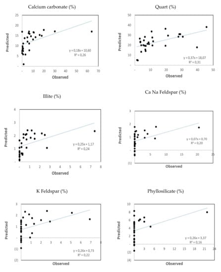 Concerning the calcium carbonate content, its abundance was expected, as this component typically accumulates in semi-arid or arid environments. High contents of CaCO3 may act as a source of calcium due to its ease weathering, leading to mechanisms of flocculation and aggregation of soil particles; secondary CaCO3 minerals can be formed and help to increase cementing effects on soil aggregates [] resulting in better structure and longer maintenance of SOC in mineral soils [] that may explain the high correlation found with SOC. Calcium carbonate has been accurately predicted using PLSR techniques in the literature [,]. Though calcium carbonate is also an important component of these soils (median CaCO3 from 1.1% to 6.3%), the variability was remarkable, with values from 0% to 60%. In this region, CaCO3 and illite in topsoil come from the erosion of areas in the upper positions. Predictions for calcium carbonate are less accurate than predictions for gypsum in this area. Similar results were found on gypsiferous soils in Iran []. The rest of the compounds considered in this study—quartz, feldspars, etcetera—were even more variable or their concentrations were negligible. Thus, they were not appropriate for modeling and were not used as indicators of soil degradation or recovery.