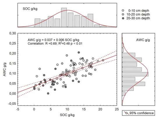 The results of AWC are shown in Table 1. There was a significant difference in the soil moisture available for plants in the upper 10 cm of topsoil (gravimetric water content 12%), which was higher than AWC for layers underneath (between 6% and 9%). Importantly, there was a correlation between SOC content and available water for plants (Figure 4). The AWC showed a normal distribution with average 0.1 g g−1 and standard deviation 0.04 g g−1. Similarly, SOC average was 10.1 g kg−1 with a standard deviation 5.1 g kg−1. In general, topsoils (10 cm) showed higher SOC and AWC, and both variables decreased over depth. In these soils, 48% of variations of available water were explained by just SOC content, as other important factors such as clay content or soil structure were not considered for this model because previous research demonstrated that texture and structure in this area are fairly uniform [].