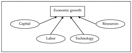 Factors driving economic growth include capital, labor, technology, and natural resources (Figure 1). Natural resources refer to the materials that human beings can directly obtain from nature and use for production and living. They mainly include land resources, water resources, climate resources, biological resources, mineral resources and energy []. Natural resources are the material basis of economic development []. The unsustainable use of natural resources is closely related to the principles or principles followed in the course of human economic activities []. The specific way of combining human and natural resources fundamentally determines the specific path of social and economic development.