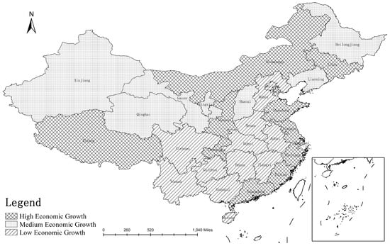 There is a large regional imbalance in China’s water resources, and there are also serious regional imbalances in economic growth []. Therefore, there are also differences in resource constraints to economic growth in different regions. In order to more fully reveal the impact of water resources in different regions of China on the economic growth of the region, this paper conducts regression analysis on 31 provinces and cities, based on panel data from 1987 to 2017 (Table 4). At the same time, according to the size of D-Water and N-GDP, 31 provinces and cities are divided into weak, medium and strong, which constitute three “Growth Drag” constraint levels (Figure 2), and low, medium and high, which constitute three economic growth types (Figure 3).