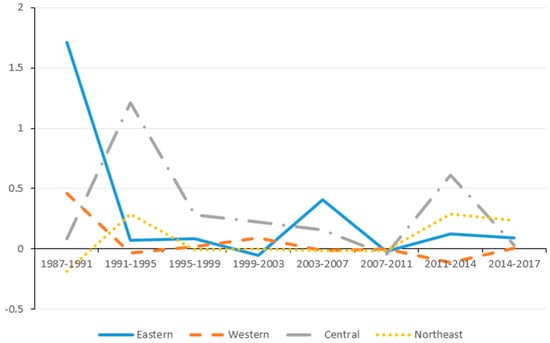 Economic growth is a dynamic process, and the impact of water resources on economic growth is also a dynamic process. In order to further study the impact degree and dynamic change process of water resources in regional economic growth, this paper uses the time variation method of the panel data to examine the changes of the drag effect of water resources on China’s eastern, western, central and northeastern regions from 1987–2017 (Figure 4, Table A3).