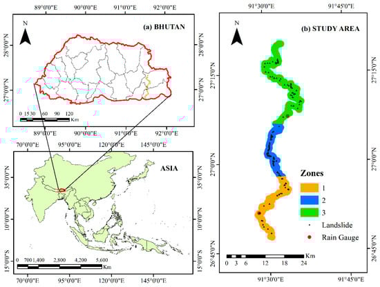 Location of (a) Bhutan; (b) spatial distribution of landslides in the study area considered in this analysis. The zones were categorized based on spatial coverage of rain gauges, rain gauge location, and elevation difference.