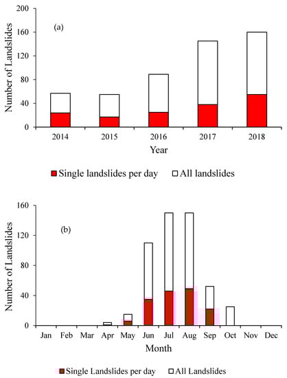 Number of landslides (a) per year and (b) per month between 2014 and 2018.