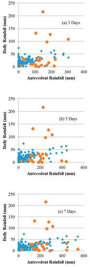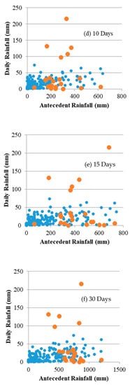For this study, the correlation between daily and antecedent rainfall conditions was analyzed for six different time periods (3, 5, 7, 10, 15, and 30 days) (Figure 5a–f). The analysis of the various antecedent rainfall time periods was conducted using the method proposed by Zezere et al. [42]. Blue dots represent the daily rainfall, whereas the orange points depict the antecedent rainfall values for respective time periods. The best discrimination between daily and antecedent conditions, according to the method suggested by Reference [42], was observed for 30 day antecedent rainfall and was accepted as the metric for threshold calculation.