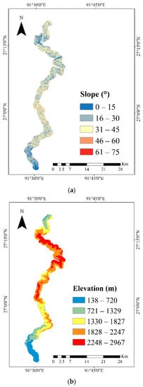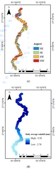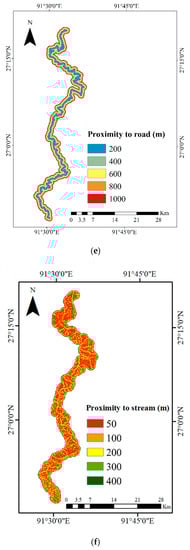 To determine susceptibility, a variety of factors responsible for landslides in the study region were considered. Parameter selection depends on various factors, such as landslide type, data availability and reliability, and adopted methods [63]. For the present study, we used eight landslide-conditioning factors based on the characteristics of the area and prepared from various data sources (Table 2). Figure 9a–f represents all the maps used for the analysis, derived from the Shuttle Radar Topography Mission (SRTM) digital elevation model (DEM) with 30 × 30 m resolution, which was the only terrain data source available for this region. The factors with continuous values were reclassified into categories based on Jenks’ natural breaks optimization method [64] and developed using ArcGIS 10.4.1.