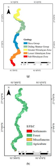 Landslide-conditioning factor maps: (a) slope, (b) elevation, (c) aspect, (d) mean daily rainfall, (e) proximity to road, (f) proximity to stream, (g) geology, and (h) land use and land cover (LULC).