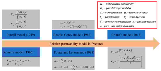 The gas-water relative permeability has been investigated through experiments, theoretical modeling, and numerical simulations. Figure 1 summarizes some classical relative permeability models and provides a brief introduction to the development of relative permeability model in recent years. The Purcell model calculated the permeability through capillary pressure data and formulated a relatively primitive permeability model [7]. This model assumes that the sum of the gas and water relative permeability is equal to 1, which does not agree with the actual fluid flow in porous media. Subsequently, this model was further modified by many scholars. Gates and Leitz [8] integrated the relative permeability from the capillary pressure. Burdine [9] thought that the assumption of capillary parallelism was not accurate and introduced the tortuosity factor into the Purcell model. Mualem [10] proposed an integration method based on the Purcell model. For simplicity, Romm [11] developed a relative permeability model which ignored the phase interference between the gas and water phases. This model is also called the X model. Brooks and Corey [12] introduced a pore-size distribution index to modify the capillary pressure function and proposed a more generalized gas-water relative permeability model. The Brooks–Corey model has been widely used in modeling two-phase flow in complex porous media. Fourar and Lenormand [13] derived a viscous coupling model after integrating Stokes’ equation and the effect of viscosity. Combined with momentum balance, viscosity, and cubic law, Chima and Geiger [14] developed a new relative permeability model. After ignoring the capillary pressure, Chima’s model became a unique form of the viscous coupling model. Li et al. [15] improved Chima’s model through the consideration of the influences of capillary tortuosity and irreducible water saturation on relative permeability. The above relative permeability models have made significant contributions to the prediction of two-phase flow in porous media. They also found that the relative permeability of the gas phase is more susceptible to the geometry of flow channels. However, these relative permeability models did not thoroughly consider the effects of complex pore microstructures on fluid flow.