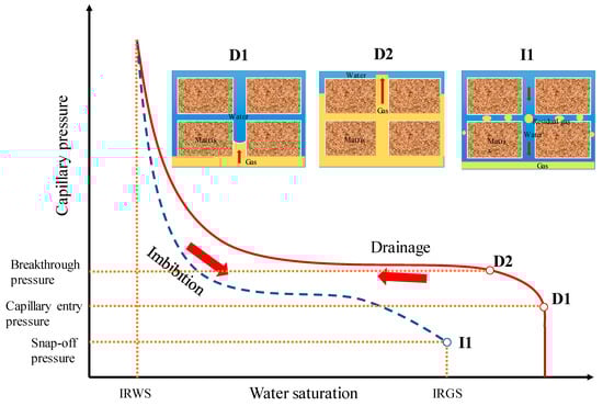 Figure 2 presents a simplified conceptual diagram to express the variation of capillary pressure with water saturation. The solid red line represents the process of gas displacing water. The initial state of the rock formation is fully water-saturated, and the pressure increases with gas injection. When the capillary entry pressure is overcome, the front of two-phase flow starts to move. The accumulated pressure will cause the gas to break through the upper boundary of the rock formation. This pressure is called breakthrough pressure. Finally, the increase of pressure does not further reduce water saturation in the fracture. This minimum water saturation is irreducible water saturation (IRWS). The blue dotted line represents the process of water imbibition. As the capillary pressure decreases, a portion of the gas is trapped in tinny pores or fractures under the wetting phase pressure. This minimum capillary pressure is often termed as snap-off pressure. The corresponding saturation is irreducible gas saturation (IRGS).