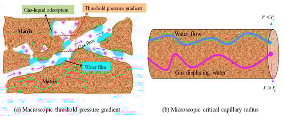 If the surface tension and contact angle are constant, the capillary pressure has an inverse proportional relationship with the pore radius. There is a critical capillary radius in the complex distribution of capillary pore size. When the pore size is larger than the critical capillary radius, the gas flow can occur in the capillary tube, and the water film is attached to the capillary wall. If the capillary tube size is smaller than the critical radius , the capillary tube is fully saturated with water and gas flow does not occur. Therefore, from the microscopic view, the gas can displace water only when the capillary tube radius is greater than the critical capillary tube radius, as described in Figure 3b.