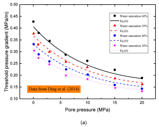 This concept of irreducible water saturation is very similar to the threshold pressure gradient (TPG) that was mentioned in our previous study [6]. From the macroscopic view, the residual water in the target reservoir blocks the pore-throat. Only when the capillary pressure is higher than the capillary entry pressure, the two-phase flow can be observed, as shown in Figure 3a. TPG is a vital parameter in describing the gas starting flow against viscous forces. This TPG makes the Darcy flow gradually transform to a low-velocity, non-Darcy flow when water saturation is gradually increasing. Many researchers have indicated that permeability, water saturation, and pore pressure are controlling parameters for TPG in tight gas reservoirs [23,25,30]. On this sense, we proposed the following formula for TPG: