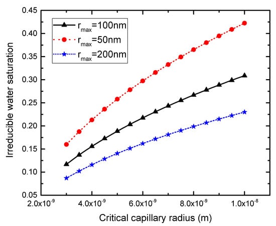 Figure 5 shows the variation of irreducible water saturation with critical capillary tube radius. No linear relationship was observed between the critical capillary radius and irreducible water saturation. When the critical capillary radius is large enough, the irreducible water saturation grows slowly and tends to be stable. In the case of the same capillary critical tube radius, the increase in the maximum capillary radius leads to a decrease in irreducible water saturation. The water flow is enhanced by the increase of capillary tube radius rather than being sealed in the capillary tube. When the critical capillary tube radius is small relative to the capillary tube size, the difference is not obvious. However, the irreducible water saturation changes from 0.2 to 0.4 when the critical capillary tube radius is 10 nm.