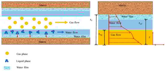 When a steady-state laminar flow occurs within capillary tubes, Figure 7 gives the flow distribution of the gas and water phases. This conceptual model has three different regions: The gas flow region, the typical viscosity water flow region, and a high-viscosity water film region. The fluid flow in these three regions has different flow mechanisms. They are mathematically described below.