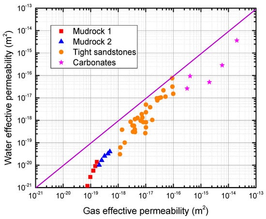 Intrinsic permeability is an inherent property of rock. It is only related to the rock microstructures and is thus independent of fluid type. For two-phase flow, the effective permeability of each phase depends on its saturation and intrinsic permeability. Experimental results have suggested that the effective permeability of non-wetting phase tends to be higher than the effective permeability of wetting phase [43]. Relevant literature has summarized following reasons [44]: (1) The rock is rich in swelling clay minerals. When the effective permeability of the wetting phase is measured, the clay mineral in the matrix absorbs water and swells. This leads to the reduction of the flow channel of fractures; (2) The existence of a water film on the structure surface reduces the effective radius of the flow channel; (3) The high viscosity of the movable water film zone increases the viscous force of normal flowing water. Thus, higher shear stress is required to start the water flow. Figure 8 compares several sets of experimental data on the relationship between water and gas permeability. These experimental data were obtained from Busch and Hildenbrand [43]. These data showed that the gas effective permeability is slightly higher than the water effective permeability. This is related to the complex micropore structure and the flow mechanism of two-phase flow.