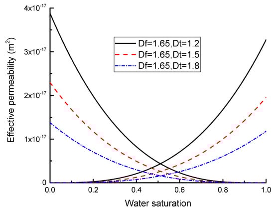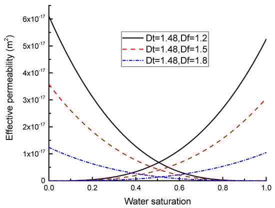 The tortuosity fractal dimension was first introduced into this improved fractal model to reflect the variation of capillary tortuosity with pore size. Figure 12 provides the variation of effective permeability of gas and water with the increase of PSD fractal dimension. This trend was similar to the variation of the PSD fractal dimension, but the degree of decline was not significant. This indicates that the influence of the PSD fractal dimension on both gas and water permeability can be greater than the tortuosity fractal dimension.