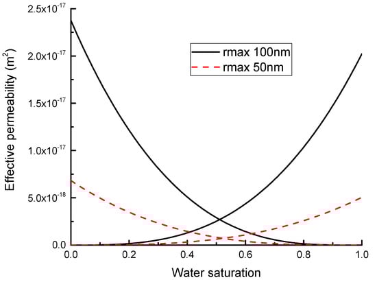 The size of nanotubes is directly related to the gas-water effective permeability. When the maximum radius of the nanotubes was changed from 100 nm to 50 nm, the gas-water effective permeability significantly declined, as shown in Figure 13. Because the capillary tube radius was still very large relative to the size of critical capillary tube radius and water film thickness, residual water cannot block the capillary tube and single-phase flow did not occur. The effective permeability of the gas and water decreased at almost the same speed.