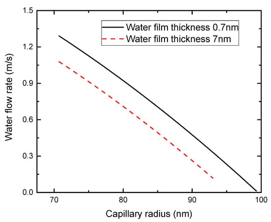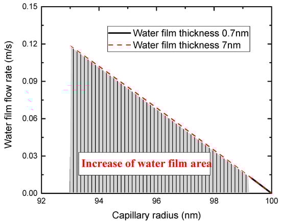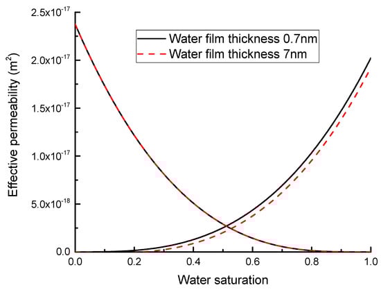 Our fractal model has some parameters in the gas or water effective permeability. For example, the water film adhered to the surface of the capillary tube is an important parameter that can affect the effective permeability of water. The viscosity of the water film is greater than that of water in the normal flowing zone. An increase in the water film thickness directly reduces the water flow flux. Moreover, the water film produces a drag force on the normally flowing water. This can reduce the flow rate of the wetting phase. Some studies have considered the water film as the non-flowable film, which absorbs on the surface of the matrix to form residual water in the porous medium. This assumption exaggerates the effect of water film on the relative permeability of the wetting phase. Equations (29) and (30) provide the expressions of water flow rate and water film flow rate, respectively. If a capillary radius is 100 nm, water saturation is 0.5, and a pressure difference is 1 MPa, the effect of water film thickness on the water and water film flow rates are presented in Figure 14, where the evolution of water flow rate is plotted under different water film thicknesses. When the water film thickness increases from 0.7 nm to 7 nm, a significant decrease in water flow rate is observed. In addition, a slight decrease of the normal water flow zone is observed due to the increase of water film thickness.