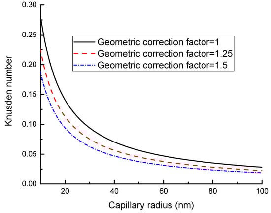 The pores in porous media have various shapes. In this paper, the relative permeability was derived based on the circular tube, and the geometric correction factor was introduced to redefine the Knudsen number (see Equation (18)). The Knudsen number reflects the motion state of gas molecules. Therefore, the change of the Knudsen number directly affects the gas flow rate, resulting in a change of the gas effective permeability. Figure 17 provides the variation of Knudsen number with a geometric correction factor. It states that the shape irregularity of pores reduced the Knudsen number. As the capillary radius increases, this effect will gradually decrease. When the flow channel is large enough, the free path of gas molecules is much smaller than the characteristic length, and the shape irregularity of the pores is no longer significant.