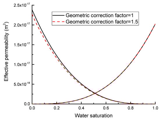 Figure 18 shows the variation of gas-water effective permeability with the increase of geometric correction factor. The increase of the geometric correction factor directly reflects the increase of capillary irregularity. Therefore, the effective gas permeability decreases when the geometric correction factor increases. The effective permeability of the wetting phase is not affected by the shape correction factor. Furthermore, the effect of the geometric correction factor is less than the effect of structural parameters (PSD fractal dimension and tortuosity fractal dimension). This may be why the capillary is generally assumed to be a circular tube in many numerical simulations, regardless of its shape variation.