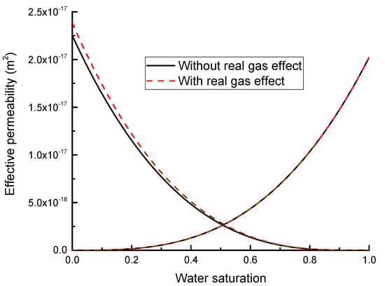 The real gas effect refers to the variation of gas compressibility and viscosity relative to ideal gas. Both temperature and pressure affect the real gas effect and ultimately lead to a change of gas flow. Figure 19 presents the importance of real gas effect on the effective permeability of water and gas. The effective permeability of gas is slightly higher after considering the real gas effect. Although the viscosity of the gas increases, the gas is more compressible when the real gas effect is considered. In addition, the increase of the Knudsen number means an enhancement of gas slip effect, which is beneficial to the effective gas permeability. These indicate that the real gas effect cannot be ignored in the evolution of gas effective permeability. This effect will become more significant in high-pressure and temperature conditions.
