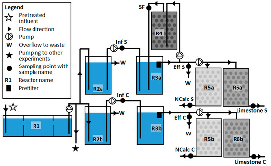 Reactors R2 to R6 were 200 L plastic barrels. The sludge at the bottom of the pumping reservoirs (R2a and R2b) was wasted once at t = 120 d by pumping to prevent sludge accumulation. Wastewater was continuously pumped into reactors R3a and R3b, which had a prefilter at the outlet (aperture of the prefilter of 1.6 mm). Part of the R3 effluent was pumped intermittently (1 min at 40 mL per minute followed by a 7.45-min rest period) by a peristaltic pump into either a non-calcareous or a limestone drainfield. The drainfields R5 and R6 were composed of 75 cm of sand over a 12.5-cm gravel layer. The influent of R5 and R6 was pumped at a depth of 12 cm into one of four inlet tubes. Each inlet tube was used for one week sequentially to ensure a uniform division of the flow. The R5 and R6 effluents were collected in the gravel layer through four 25-mm diameter pipes with 3-mm perforations. Pilot tests were paused between days 92 and 152. During the pause, reactors R2 to R4 were kept saturated, and reactor R1 remained in operation.