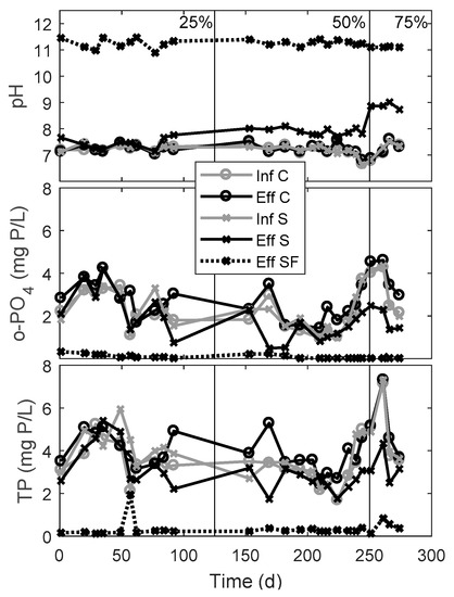 The P removal performance of the sidestream system is shown in Figure 2 for the septic tanks and Figure 3 for the drainfields. The control septic tank without a slag filter had an influent pH of 7.2 ± 0.2 which remained stable in the R3b compartment. The R3b compartment released o-PO4 (Figure 2), probably due to sludge hydrolysis. The slag filter resulted in a favorable pH above 11, and an effluent o-PO4 and TP below 0.1 and 0.3 mg P/L, respectively, during the 275 days of the tests. The water quality of the slag filter effluent was consistent with previous observations from the slag filters of the same media [17]. The cumulative P retention of the slag filter increased slowly up to 105 mg TP/kg slag (Figure 4), which is lower than the cumulative removal of 300–1700 mg TP/kg slag observed in six recent slag filter studies for domestic wastewater treatment [6]. The low P retention observed in the filter might be at least due to the short duration of the experiment; the filter had not yet reached its saturation. The mean P removal percentage was similar in all tested recirculation ratios (87%, 85% and 86% at the recirculation ratios of 25%, 50% and 75%, respectively).