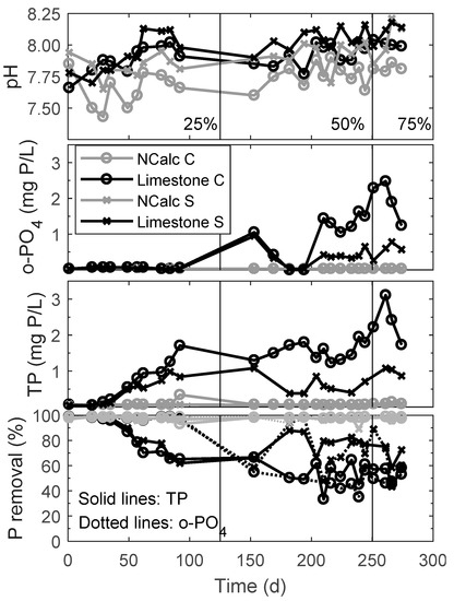 The septic tank with a sidestream slag filter improved the TP removal efficiency compared to the control septic tank at recirculation ratios of 50% and 75% (Figure 2), reaching removal efficiencies of 11% and 32% at recirculation ratios of 50% and 75%, respectively. The o-PO4 removal was markedly improved, reaching 40% at a recirculation percentage of 75% (Table 5, all data different from the control at t < 0.02, except when indicated). TP and o-PO4 removal at the 25% recirculation ratio was not significantly different from the control test. A larger pH resulted in lower TP and o-PO4 concentrations in the R3a compartment of the experimental septic tank, in which the pH increased to 8.9 at the 75% recirculation ratios. The pH increase was due to the slow dissolution of the slag filter, which added hydroxide and calcium into the septic tank supernatant. Note that the P removal efficiency of the slag filter and the septic tanks was not affected by the seasonal changes in the experiment at the 25% recirculation ratio (e.g., the experiment started in the Fall, but the recirculation ratio changed to 50% in Winter). This observation contrasts with other field slag filters experiments that showed seasonal fluctuations in removal efficiency [15].