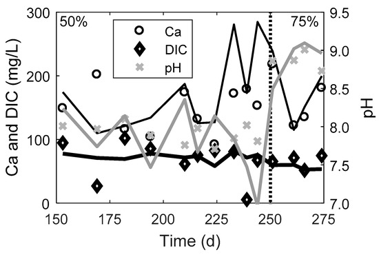 The proposed mechanism governing DIC concentration in slag filter-upgraded septic tanks is the precipitation of calcium carbonate monohydrate at a saturation index of 0.6 with an inhibited biological production of CO2. The proposed mechanism was supported by a successful model calibration using experimental data at the 50% and 75% recirculation ratios (Figure 5). The pH, DIC and calcium concentrations in the septic tank effluent were reproduced well by simulations. The calibrated biological CO2 input was 21 and 0 mg/L at 50% and 75% recirculation ratios, respectively. Note that the septic tank influent and the slag filter effluent characteristics were properly calibrated, as shown in Supplementary Materials, Table S3.