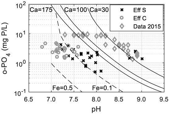 The o-PO4-pH relationship in the septic tank effluent is shown in Figure 6. In this figure, experimental results are compared to former data of the effluent of a lab-scale septic tank with sidestream slag filter fed by the effluent of the second compartment of the septic tank [13]. Equilibrium curves of hydroxyapatite and vivianite are shown as possible P removal mechanisms by precipitation. Hydroxyapatite equilibrium curves were drawn at relevant fixed calcium concentrations: the effluent in the 2015 study had a stable calcium concentration of 30 mg/L, while most of the present study samples had a calcium concentration between 100 mg/L and 175 mg/L. Vivianite equilibrium curves were drawn at iron concentrations of 0.1 mg/L and 0.5 mg/L, which is the approximate range observed in ten different real septic tanks [20].