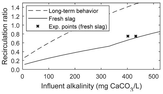 The recirculation ratio needed to reach a pH of 9 at the effluent of the septic tank is shown in Figure 7, based on simulations of slag filter upgraded septic tank (influent calcium concentration fixed at 175 mg/L). Two slag filter hypotheses were tested: fresh slag which is assumed at the beginning of the filter lifetime, and long-term behavior of slag according to a slow slag exhaustion. Note that simulations agree with experimental data in this study (influent of 400 to 500 mg CaCO3/L alkalinity, slag filter effluent of 11.1, recirculation ratio of 75% and pH at the effluent of septic tank of 8.7 to 9.0, experimental points shown in Figure 7).