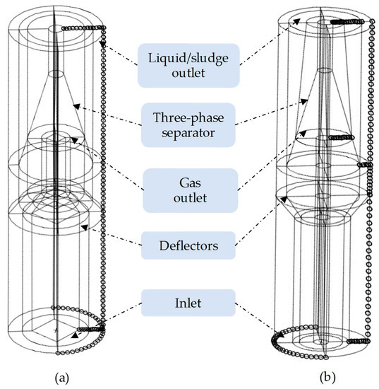 The volumetric fractions of the involved phases (water, biogas and sludge) were reported in Lima et al. [26]. According to these authors, the highest sludge concentrations (validated by the experimental results) are in the inlet region (sludge blanket) and on the sloping walls of the three-phase separator and the gas deflector.