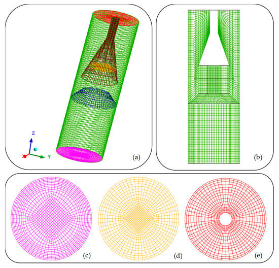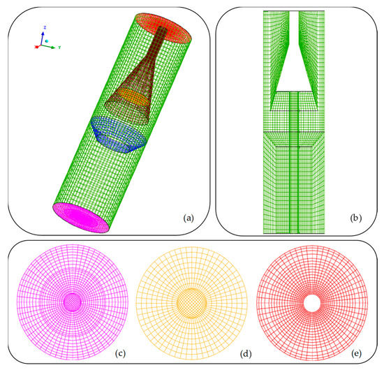 Mesh representation with deflector inclination downwards: (a) overview, (b) plan yz, (c) inlet (z = 0 m), (d) biogas outlet (z = 2.29 m), and (e) output of sludge and biogas (z = 3.58 m).