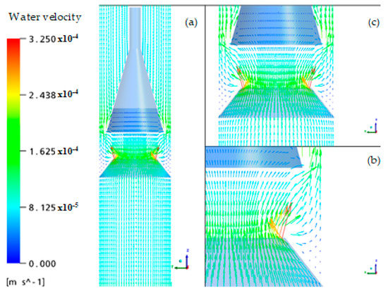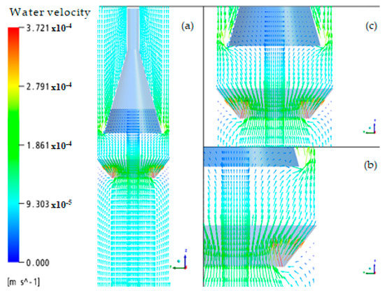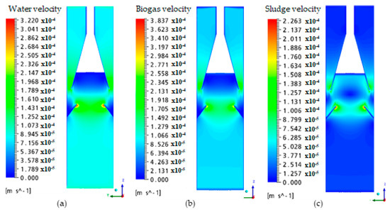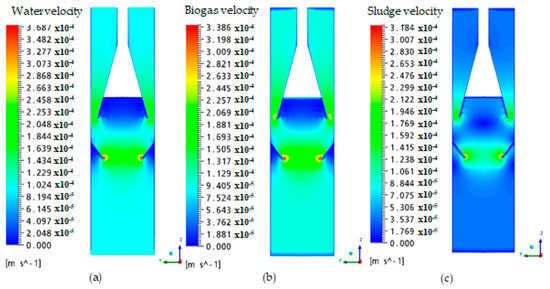 Figure 4 and Figure 5a–c illustrate the isosurfaces of velocities of water, biogas and sludge on the zx plan, for the geometries of the UASB reactor with inclination of the deflector upwards and downwards, respectively.