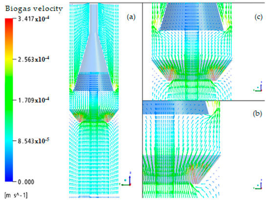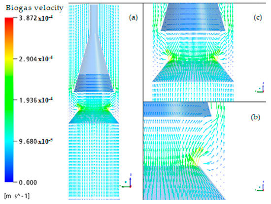 Biogas velocity vector in the reactor with deflector inclination downwards: (a) overview, (b) detail of the region between the gas deflector and the three-phase separating element, and (c) detail of the region corresponding to the settling zone.