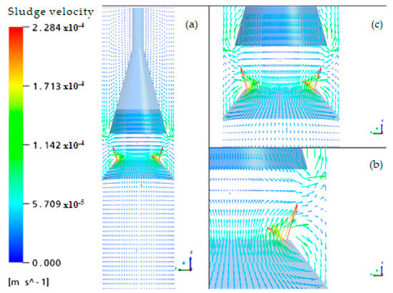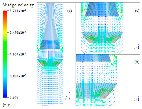 Sludge velocity vector in the reactor with deflector inclination downwards: (a) overview, (b) detail of the region between the gas deflector and the three-phase separating element, and (c) detail of the region corresponding to the settling zone.