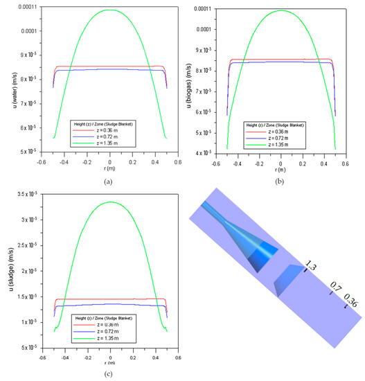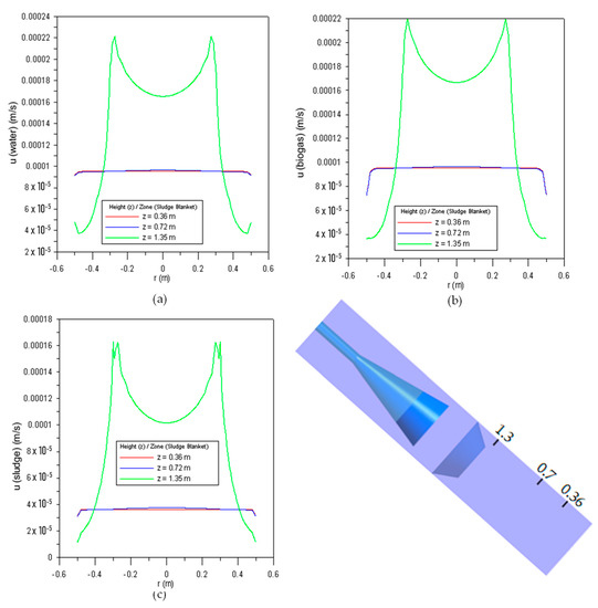 Distribution of the resulting velocity according to the radial position for different axial positions, z, on the sludge blanket region (upward inclination of the deflector): (a) water, (b) biogas, and (c) sludge.