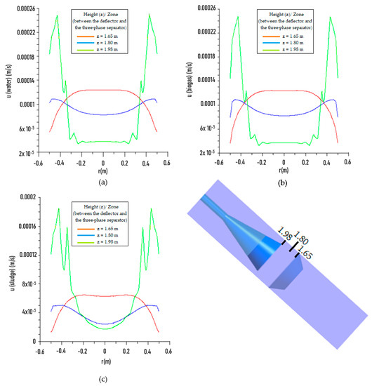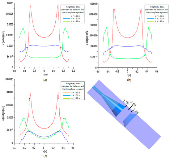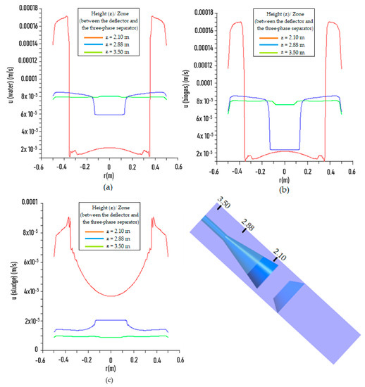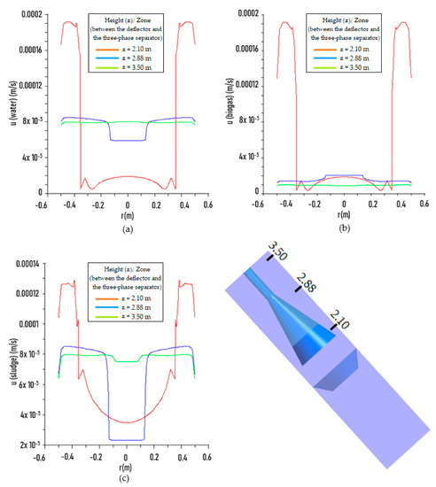Distribution of the resulting velocity according to the radial position for different axial positions, z, on the region between the deflector and three-phase separator (downward inclination of the deflector): (a) water, (b) biogas, and (c) sludge.
