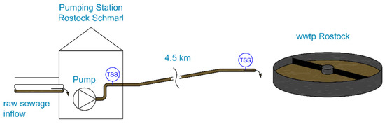 Schematic view of the study side. Total suspended solids (TSS) are measured inside the pressure pipe in pumping station (PS) Rostock-Schmarl and at the outflow side in the wastewater treatment plant (wwtp) Rostock after 4.5 km.