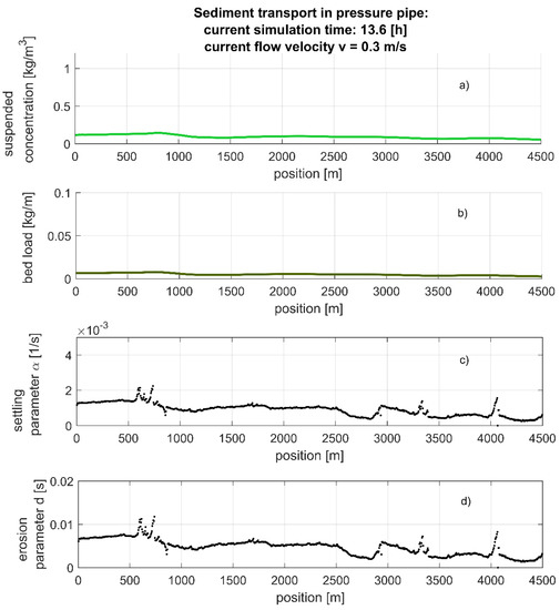 To illustrate the continuous adaptation of the model parameters, Figure 2 shows, exemplarily, the status bar of the sediment transport simulation. At the current simulation time 01:36 p.m. the pumps generate a flow velocity of 0.3 m/s. Figure 2a–d show the simulated values for suspended load (Figure 2a), bed load (Figure 2b), the settling parameter α (Figure 2c), and the erosion parameter d (Figure 2d) over pipe length (4500 m).