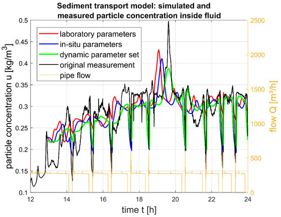 Results of the sediment transport simulation. Particle concentration measured and simulated with laboratory, in situ, and dynamic parameters with slightest deviation.