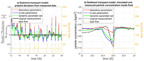 The present deviation to the reference values are shown in Figure 4a and calculated as (umodel − ureference)/ureference. A positive deviation within the settling sequences (Q = 0) remarks an underestimation of the settling process, while reversely a positive deviation within the erosion sequence remarks an overestimation of the real erosion process. Both, under and overestimation occurs within the settling and erosion sequences, with maximum values of ≈+109% (for laboratory parameters) (underestimation of settling sequence). The variable parameter set simulation deviated at a maximum of +75% (underestimation of settling sequence) at the beginning and reduced to ≈+50% during the later simulation.