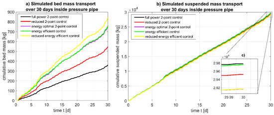 The resulting bed load and suspended load transport is shown in Figure 6. Figure 6a shows the cumulative bed load while Figure 6b,c shows the cumulative suspended load over 30 days simulation. Table 2 summarizes the simulation results for all five pump control modes including the calculated energy demand.