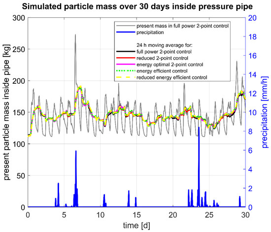 The effect of storm water inflow to sediment transport inside pressure pipe were evaluated for the same 30 days period as described in the previous section. Several rain events are recorded during this period in the catchment area of PS Rostock-Schmarl. Figure 7 shows the present amount of sediments inside the pressure pipe, simulated over 30 days for all five control modes. The present particle mass was calculated as the total sediments quantity in all grid cells per time step (including both suspended and bedload). Figure 6 shows the present particle mass inside the pressure pipe for full power two-point control in detail (grey line) and for better visualization the 24 h simple moving average of the present particle mass of all five control modes (black to yellow lines).