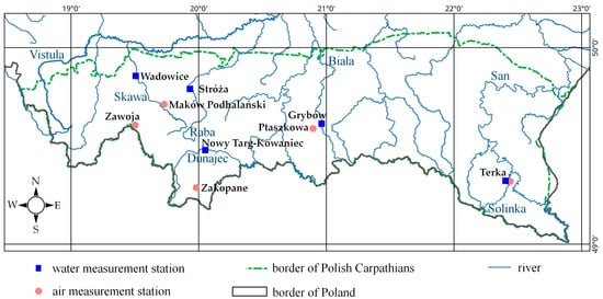 The research was carried out on five Carpathian rivers in the upper Vistula Basin in southern Poland, within the 49–50° N and 19–23° E coordinates (Figure 1). The Skawa and Raba Rivers originate in the Żywiec Beskids and Gorce Mountains, respectively. The upper Dunajec drains water from the Tatra Mountains, the highest mountain range in the Carpathians. The Biała River, a right-bank tributary of the Dunajec, originates in the Low Beskids. The Solinka is the left tributary of the San River; it originates in the Bieszczady Mountains. The Beskids, Gorce and Bieszczady Mountains are underlain by flysch composed by sandstone, shale, and marl, while the Tatras are underlain by poorly permeable sandstone and shale, impermeable crystalline and metamorphic rocks, and highly permeable carbonate rocks [24]. The dominant soil type is Cambisol. Climate conditions in the study area vary depending on location. The highest peaks of the Tatras (2200–2600 m above sea level (a.s.l.)) and the Beskids (1100–1700 m a.s.l.) are characterized by cold and cool climates, respectively, while in the lower-lying parts of the catchments the climate is temperate [25].